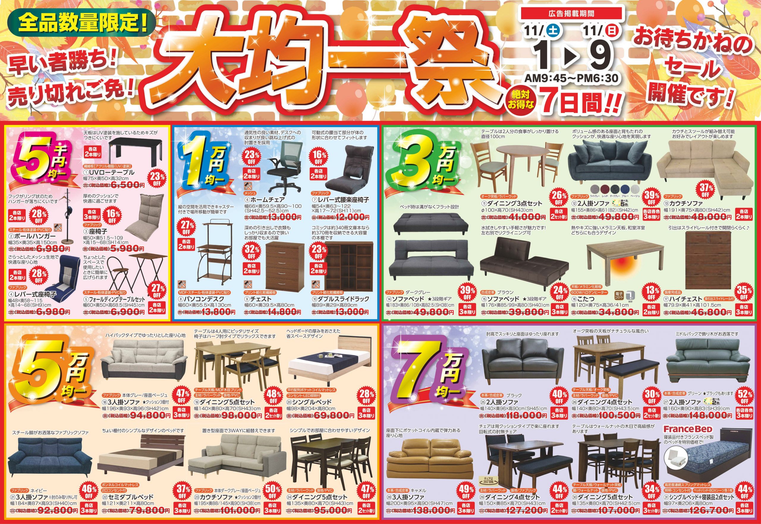 🍁秋の大均一祭🍁 🍂11/1(土)~11/9(日)まで🍁 お得な7日間!! 神島高岡店・富山店大均一祭開催! お買い得充実! 今が買い時!! すべて超特価限定商品です!!! お早めに!!!! 1万円~7万均一で多数のお買い得品をラインナップ! どれも数量限定なのでお買い求めはお早め😍 店内商品多数お買い得がいっぱいです! ご来店おまちしております!☺