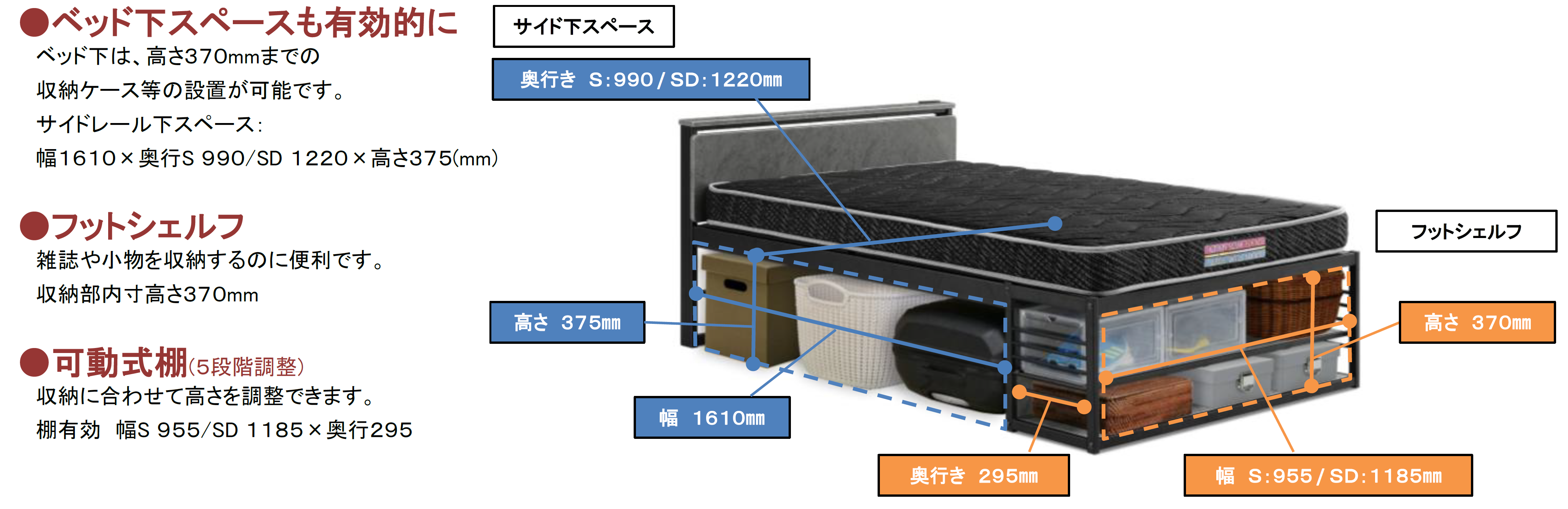 • ベッド下を有効に使える、収納スペース付きベッド
